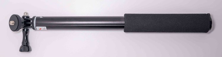 This four-piece extension pole can be twist locked off at any length from its starting point of 30cm to its fully extended range of 90cm. The attachment bracket has a sturdy GoPro mount with ¼ 20’ screw. The handle is made of foam, which may wear down quite quickly with repeated use. On the base of the handle is a female ¼ 20’ screw and a small loop for a wrist strap. It’s well made and thought out.